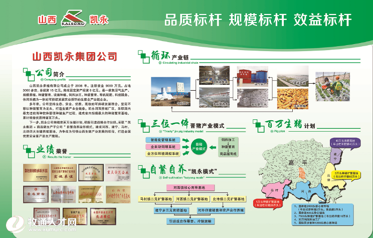 山西凱永養(yǎng)殖有限公司成立于2006年,注冊資金9000萬元,占地3000多畝,總投資15億元,完成固定資產(chǎn)投資13億元。是一家集沼氣生產(chǎn)、規(guī)模養(yǎng)殖、種豬繁育、設(shè)施種植、飼料加工、生豬屠宰、種苗繁育、有機配肥、加工冷藏、科技服務(wù)、休閑采摘為一體的科技創(chuàng)新、可持續(xù)發(fā)展農(nóng)業(yè)循環(huán)的全產(chǎn)業(yè)鏈企業(yè)。