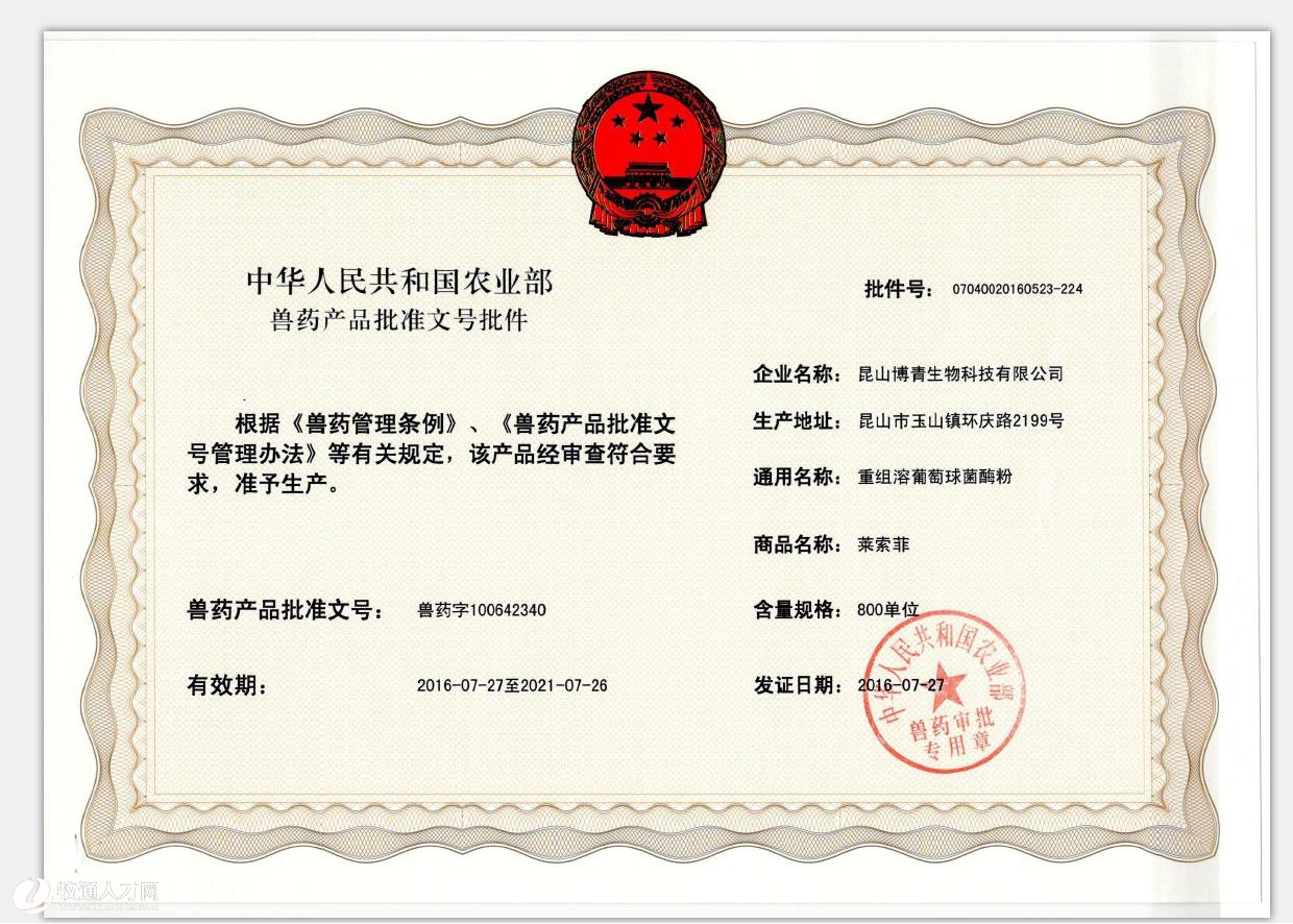 昆山博青生物科技有限公司是一家專注動物生物型抗感染藥物的研發(fā)、生產(chǎn)和銷售的高新技術企業(yè)。建有國家級博士后科研工作站,擁有我國首個具有自主知識產(chǎn)權的生物型抗菌一類新獸藥,是國內(nèi)最早一批致力于采用生物技術解決畜牧業(yè)抗生素濫用問題的創(chuàng)新性企業(yè)。是 “十三五國家重點研發(fā)計劃”、“國家發(fā)改委高技術產(chǎn)業(yè)化專項”、“國家星火計劃”等20余項國家/省級重要課題項目主持承擔企業(yè)。是全球最大的重組溶葡萄球菌酶發(fā)酵生產(chǎn)基地,在溶葡萄球菌酶產(chǎn)業(yè)化領域處于國際領先地位。 博青公司目前主要服務于反芻動物、豬、寵物等三個領域。 地址:江蘇省昆山市環(huán)慶路2199號