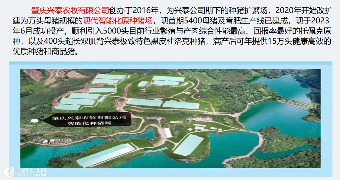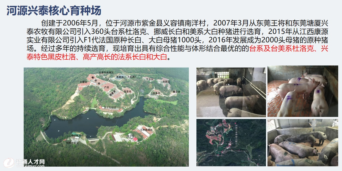 河源興泰農(nóng)牧股份有限公司,創(chuàng)辦于2006年,總部位于廣東省河源市,是一家以選育、生產(chǎn)和銷售高品質(zhì)種豬為主、為客戶提供優(yōu)質(zhì)健康種豬解決方案的現(xiàn)代化育種集團。公司現(xiàn)有興泰農(nóng)牧紫金原種豬場、紫金瓦溪擴繁場、東源富嘉、肇慶高要商品場和肇慶懷集5個基地共10000頭母豬存欄,年出欄種豬和商品豬25萬多頭。規(guī)劃3年內(nèi)新擴建肇慶懷集興泰(已建)、清遠興泰和河源連平興泰共三個基地3.5萬頭母豬規(guī)模,規(guī)劃母豬4萬和年出欄種豬和商品豬達到100萬頭。