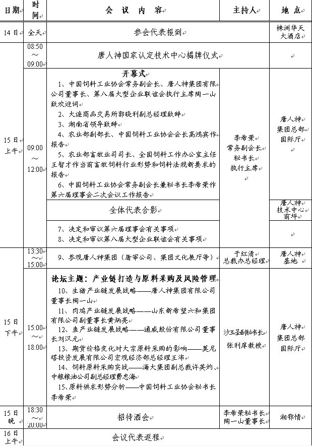 1.本次會議是本年度行業(yè)內(nèi)的一大盛會,會議規(guī)模大、層次高,請各參會代表特別是協(xié)會副會長和大型企業(yè)聯(lián)誼會主席團主席提前安排好工作,準(zhǔn)時出席。如不能出席,請本人向中國飼料工業(yè)協(xié)會秘書處請假。為便于給大家做好會務(wù)的安排和接待工作,務(wù)請各參會代表于10月20日前將參會代表回執(zhí)(見附件2)填好后傳真至唐人神集團。