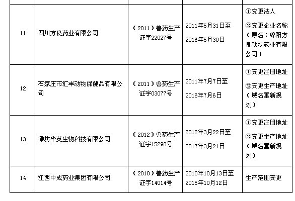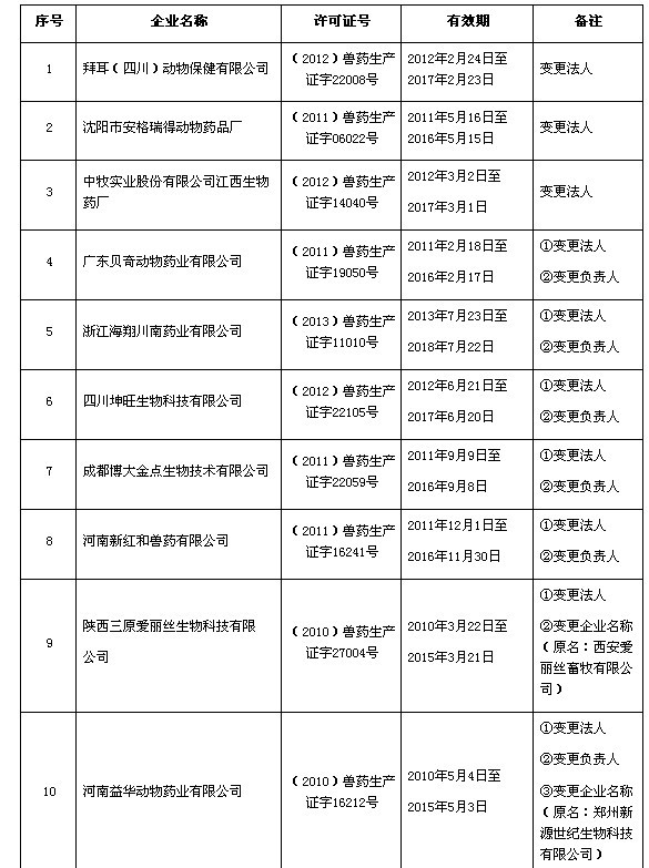 根據(jù)《獸藥管理條例》規(guī)定,經(jīng)審核,拜耳(四川)動物保健有限公司等14家企業(yè)符合獸藥生產(chǎn)許可證核發(fā)條件,現(xiàn)核發(fā)《獸藥生產(chǎn)許可證》(詳見附件)。
