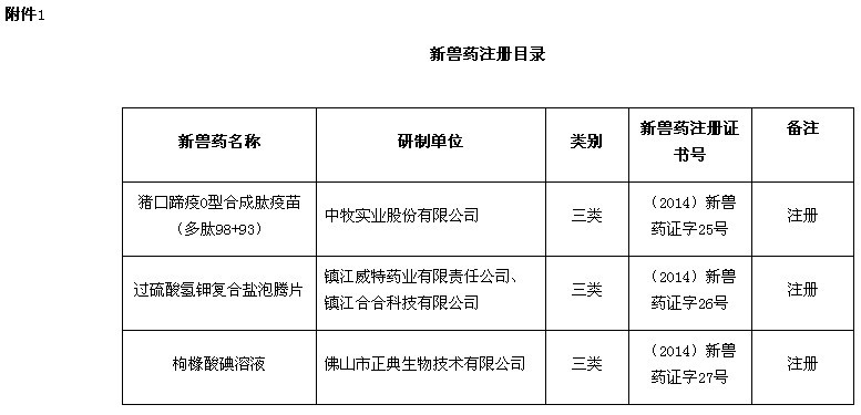 根據(jù)《獸藥管理條例》和《獸藥注冊辦法》規(guī)定,經(jīng)審查,批準(zhǔn)中牧實業(yè)股份有限公司等4家單位申報的豬口蹄疫O型合成肽疫苗(多肽98+93)等3種獸藥產(chǎn)品為新獸藥,現(xiàn)核發(fā)《新獸藥注冊證書》,并發(fā)布產(chǎn)品試行規(guī)程、質(zhì)量標(biāo)準(zhǔn)、說明書和標(biāo)簽,自發(fā)布之日起執(zhí)行。