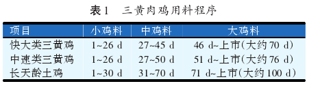 1.1根據(jù)飼養(yǎng)日齡不同,三黃肉雞大致分成3個(gè)飼養(yǎng)階段,其中:小雞階段使用小雞料、中雞階段使用中雞料、大雞階段使用大雞料等3種,其用料程序見(jiàn)表1。