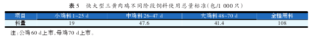 4.1.4根據(jù)以上分析,上市肉雞飼料增重比最低、次雞率最高時(shí),其各階段飼料使用總量數(shù)據(jù),對(duì)于指導(dǎo)大生產(chǎn)具有重要的參考價(jià)值,可看作快大型三黃肉雞不同階段飼料使用總量料量標(biāo)準(zhǔn)(見(jiàn)表5)。