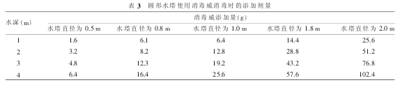 畜禽飲用水的凈化消毒方法在豬場(chǎng)規(guī)劃建設(shè)時(shí)就應(yīng)該設(shè)計(jì)好,一般養(yǎng)殖場(chǎng)基于成本的原因往往采用化學(xué)消毒法。豬場(chǎng)的飲水量大,同時(shí)水塔/水箱容積較小,往往采用“藥物緩釋消毒法”,即一次投藥后保持一定時(shí)期對(duì)水的有效消毒,利用進(jìn)水管口水流速度大小緩慢釋放藥物,達(dá)到消毒要求的藥物濃度的藥量。該方法在第1次使用時(shí)需要進(jìn)行試驗(yàn),確保消毒劑在設(shè)定的消毒時(shí)期內(nèi)被完全釋放,如利用消毒威(湖南五指峰生化有限公司生產(chǎn))對(duì)圓形水塔消毒方法見(jiàn)表3。