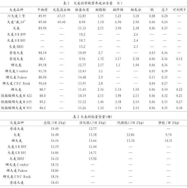 國內(nèi)外研究者對大麥的常規(guī)營養(yǎng)成分含量做了大量研究,見表1。由表1可以看出,不同大麥中干物質(zhì)含量變化范圍是 88.0%~91.7%,平均值為89.23%;粗蛋白質(zhì)含量變化范圍8.90%~14.18%,平均值為11.53%;粗脂肪含量的變化范圍是1.10%~3.17%,平均值為2.18%;粗纖維含量的變化范圍是1.10%~6.90%,平均值為3.63%;粗灰分含量的變化范圍是1.50%~3.18%,平均值為2.36%;鈣含量的變化范圍是0.05%~0.11%,平均值為0.06%;總磷含量的變化范圍是0.20%~0.39%,平均值為0.32%;可利用磷含量范圍0.12%~0.30%。裸大麥的粗蛋白及粗纖維含量較高,低植酸大麥的可利用磷含量較高。