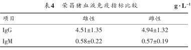 由表4可知,榮昌豬血清IgG、IgM在性別間無顯著差異(P>0.05) 。
