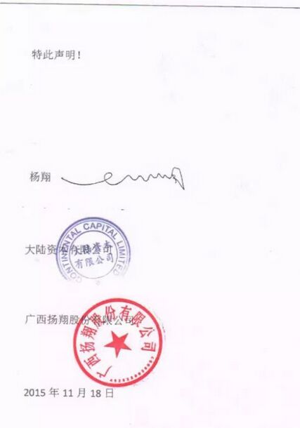 四、大陸資本有限公司作為標(biāo)的資產(chǎn)的戰(zhàn)略投資者,與廣西揚(yáng)翔有著長期合作關(guān)系,認(rèn)可廣西揚(yáng)翔商業(yè)模式以及管理層為發(fā)展飼料業(yè)務(wù)所作出的卓越努力。我們將在上述戰(zhàn)略合作事項中,支持楊翔先生所作出的決定。