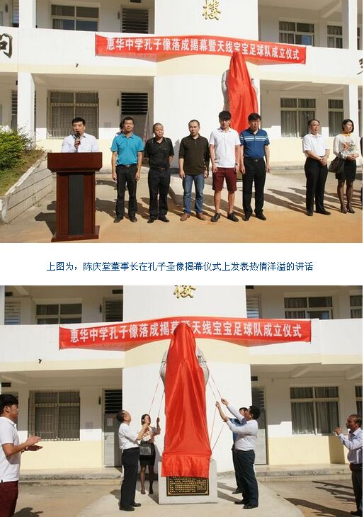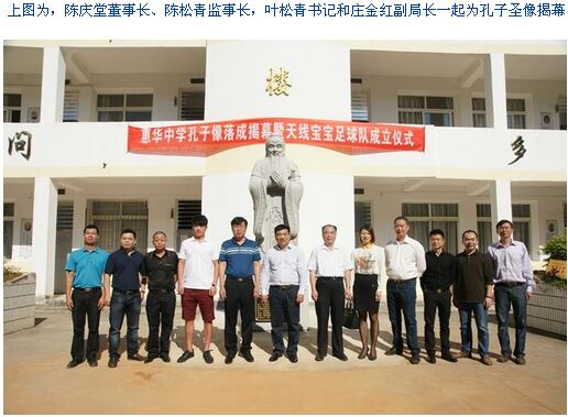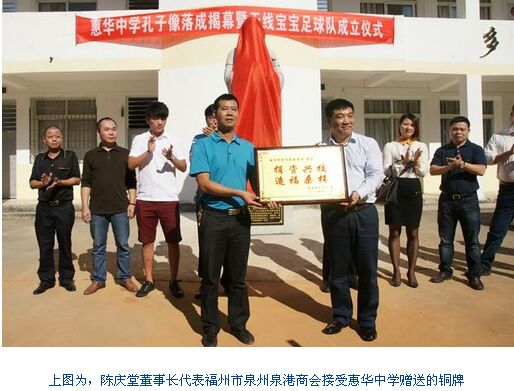 11月23日上午,福建省泉州市泉港區(qū)惠華中學舉行孔子像落成暨天線寶寶足球隊成立儀式。泉港政協(xié)副主席、泉港區(qū)工商業(yè)聯(lián)合會(總商會)主席、福州市泉州泉港商會會長、福建天馬科技集團股份有限公司董事長陳慶堂先生,福州市泉州泉港商會監(jiān)事長陳松青先生,泉港區(qū)界山鎮(zhèn)黨委書記葉松青,泉港區(qū)區(qū)教育局副局長莊金紅應邀出席儀式,并共同為新落成的孔子圣像揭幕?;萑A中學全體師生參加了儀式。