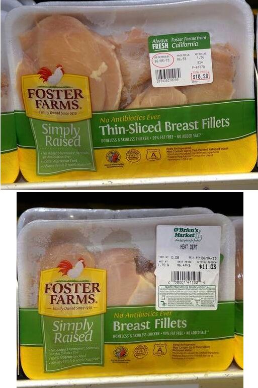 據(jù)《莫德斯托蜂報》(Modesto Bee)報道,2015年6月1日(星期一)早上,福特農(nóng)場無抗雞肉(Antibiotic-free Foster Farms chicken)在美國加利福尼亞州中部城市莫德斯托(Modesto) 市場銷售,從新聞稿圖片傳達的信息顯示,此雞肉當日售價為6.53美元/磅,約合7.2美元/斤,相當于44.57元(人民幣)/斤