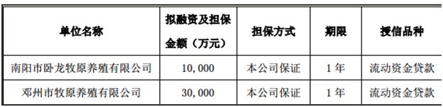 3、公司將根據(jù)子公司的實(shí)際需要與相關(guān)銀行簽訂擔(dān)保合同,但與各家銀行簽訂的擔(dān)保合同的總額不得超過該子公司經(jīng)批準(zhǔn)擔(dān)保額度,相關(guān)期限、種類等以實(shí)際發(fā)生時(shí)簽訂的融資合同文件為準(zhǔn)。單位名稱擬融資及擔(dān)保金額(萬元)擔(dān)保方式期限授信品種南陽市臥龍牧原養(yǎng)殖有限公司10,000本公司保證1年流動資金貸款鄧州市牧原養(yǎng)殖有限公司30,000本公司保證1年流動資金貸款。