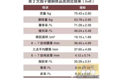 2012 年對(duì)湖南天府生態(tài)農(nóng)業(yè)有限公司大圍子豬資源場(chǎng)的8頭大圍子豬進(jìn)行了屠宰試驗(yàn)和肉質(zhì)測(cè)定,其結(jié)果為:大圍子豬的屠宰率和瘦肉率分別為71.28% 和46.24% ;肌肉粗蛋白含量21.60%,肌內(nèi)脂肪含量4.34%,蛋白含量較高,脂肪含量適中,均屬理想肉質(zhì)范圍,表現(xiàn)了較好的肉質(zhì)和豐富的營(yíng)養(yǎng)價(jià)值;風(fēng)味氨基酸含量豐富,達(dá)62.70%,特別是天門(mén)冬氨酸含量高達(dá)8.03%,相比湖南省其他地方豬種,高出2 - 3個(gè)百分點(diǎn);含Zn量為16.01 mg.kg-1,高出省內(nèi)其他地方豬種6.95% - 38.14%,從量化指標(biāo)上反映了大圍子豬的優(yōu)良肉質(zhì)。大圍子豬胴體品質(zhì)和肌肉成分見(jiàn)表2和表3。