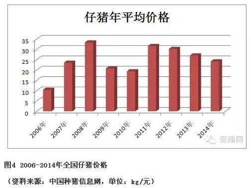 自2006年以來,全國仔豬平均價格總體上呈現(xiàn)上揚(yáng),整體走勢和生豬價格走勢相吻合。在2008年4月出現(xiàn)有史以來的最高點(diǎn),達(dá)到46.88元/kg;在2006年5月達(dá)最低點(diǎn),為6.15元/kg。