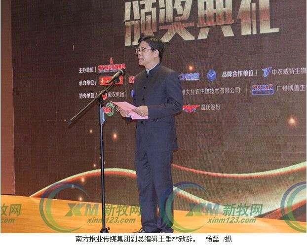 出席本次年會(huì)的頒獎(jiǎng)嘉賓有:南方報(bào)業(yè)傳媒集團(tuán)副總編輯王垂林,廣東省農(nóng)業(yè)廳副廳長鄭惠典,中國畜牧業(yè)協(xié)會(huì)常務(wù)副秘書長殷成文,廣東省飼料協(xié)會(huì)名譽(yù)會(huì)長莫棣華,華南農(nóng)業(yè)大學(xué)教務(wù)處處長張永亮,華南農(nóng)業(yè)大學(xué)動(dòng)物科學(xué)學(xué)院副院長謝青梅,江西農(nóng)業(yè)大學(xué)動(dòng)科院副院長丁能水,中國獸醫(yī)藥品監(jiān)察所研究員寧宜寶,中國農(nóng)科院哈爾濱獸醫(yī)研究所研究員田志軍,華南農(nóng)業(yè)大學(xué)宋長緒研究員,華南農(nóng)業(yè)大學(xué)管武太教授,華南農(nóng)業(yè)大學(xué)水產(chǎn)系主任劉麗,中農(nóng)威特生物科技股份有限公司董事長、總經(jīng)理張?jiān)频?,南方農(nóng)村報(bào)社總編輯陳永,南方農(nóng)村報(bào)副總編輯麥倩明,中國漁業(yè)報(bào)主編白靈,南方農(nóng)村報(bào)編委兼《農(nóng)財(cái)寶典》水產(chǎn)版主編張璐,等等。