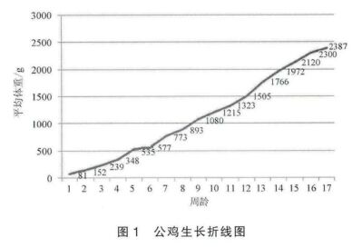 由公雞生長折線圖可知,1-17周齡為公雞生長高峰期,從第18周齡開始生長減緩、增重速度開始下降。18周齡前飼料轉(zhuǎn)化率、飼料報(bào)酬高,此時(shí)雞群已達(dá)上市體重,經(jīng)濟(jì)效益最好。