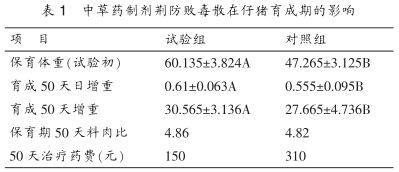 (1)試驗表明,在育成期的生豬飼料中添加荊防敗毒散500g/t,對育成的增重有顯著效果。試驗組比對照組保育日增重提高2.9kg、日增重提高5.5g,差異極顯著(P<0.01);雖然育成期50天料肉比試驗組比對照組少0.04,但是50天育成期的藥費減少60元。