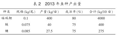 從2013年6月10日投放夏花魚種到9月15日出池,共產出福瑞鯉400kg/畝,合計4000kg;鰱、鳙67.5kg/畝,計675kg。詳見表2。