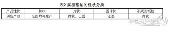 在水產(chǎn)上應(yīng)用的腐植酸鈉從外形上主要可分為粉狀、片狀、圓球狀和不規(guī)則顆粒這幾個(gè)類型(具體對(duì)應(yīng)產(chǎn)地見表2)。