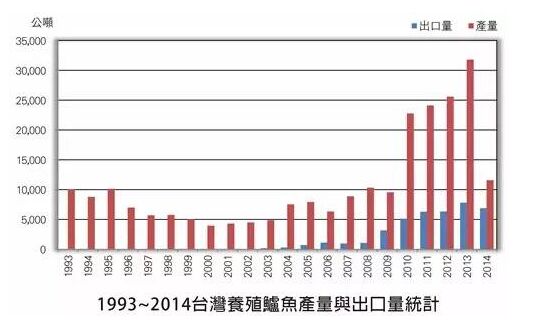 2003年鱸魚外銷數(shù)量約200-300噸,外銷數(shù)量成長快速,2006年即突破千噸,至2010年起都維持在5000噸以上。受到外銷刺激,鱸魚年產(chǎn)量也節(jié)節(jié)攀升,由2003年的4000余噸,逐年漸增到2013年的最高峰,約31000噸。