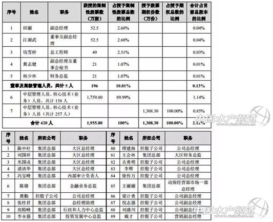 集團(tuán)大區(qū)總經(jīng)理陳中柱、劉國祥、米國成、諸清華等158人獲授限制性股票數(shù)1759.8萬股,控股子公司副總經(jīng)理李少遠(yuǎn)等257人獲授股票期權(quán)1308.3萬股。