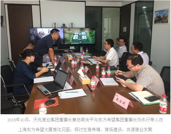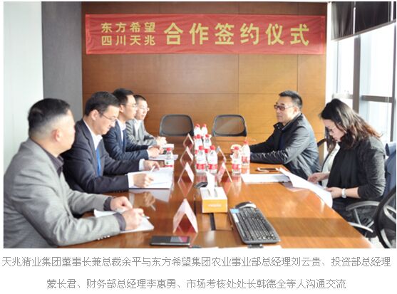 2016年2月26日,為了促進(jìn)養(yǎng)殖行業(yè)發(fā)展,幫助農(nóng)民增產(chǎn)增收。擁有種豬生產(chǎn)和養(yǎng)殖技術(shù)優(yōu)勢的天兆豬業(yè)集團(tuán)與國內(nèi)知名飼料生產(chǎn)集團(tuán)東方希望集團(tuán)在東方希望總部會議室簽訂合資合作協(xié)議。東方希望集團(tuán)農(nóng)業(yè)事業(yè)部總經(jīng)理劉云貴、投資部總經(jīng)理蒙長君、財務(wù)部總經(jīng)理李惠勇、市場考核處處長韓德全及天兆豬業(yè)集團(tuán)董事長兼總裁余平等領(lǐng)導(dǎo)出席本次會議。