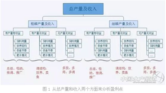 養(yǎng)殖一個周期,不論賺錢或虧本,都要總結經(jīng)驗。虧了,分析原因,看究竟是什么問題所造成的結果;賺了,總結經(jīng)驗,為下一輪養(yǎng)殖效益的提升創(chuàng)造條件。如2015年精養(yǎng)池塘通過放養(yǎng)不同梯度規(guī)格的草魚和提高花白鰱的放養(yǎng)規(guī)格、密度的養(yǎng)殖戶整體盈利情況都不錯。當然放養(yǎng)模式的調(diào)整側重點在盈利點上,只有找到盈利點上的原因才有解決的辦法。如何找盈利點來調(diào)整放養(yǎng)模式呢?如圖所示,從總產(chǎn)量和收入兩個方面來逐一分析盈利點,在通過盈利點來調(diào)整養(yǎng)殖模式。