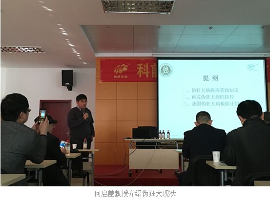 何啟蓋教授為到場經(jīng)銷商介紹當(dāng)前偽狂犬流行形勢。何啟蓋教授表示,目前流行的變異毒,并非來自于不同毒株的重組。偽狂犬的傳播主要來自于空氣(2-3km)、引種、藍(lán)耳病的血清馴化、垂直傳播和鼠類等動(dòng)物傳播。疫苗的使用可以有效控制偽狂犬病毒的散毒,但不能清除感染豬體內(nèi)的病毒。何啟蓋教授認(rèn)為減量免疫的做法并不可取,建議母豬每年免疫3-4次,小豬結(jié)合抗體水平測定進(jìn)行免疫,并且應(yīng)該重視滴鼻免疫在偽狂爆發(fā)中的作用。