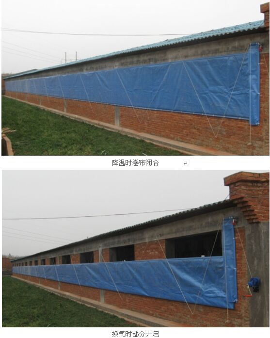 夏季較熱,冬季期短且無結(jié)冰現(xiàn)象的地區(qū),豬場以縱向降溫通風(fēng)為主。部分豬舍冬季通風(fēng)換氣可以配以側(cè)墻的卷簾口進風(fēng)。(附圖五)