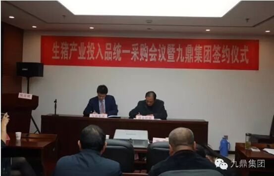 最后,霍鳴新理事長(zhǎng)代表豬業(yè)聯(lián)盟、周總裁代表九鼎集團(tuán)簽定了飼料合作協(xié)議。
