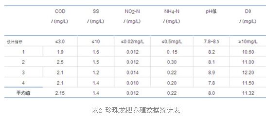 表2為2015年3月-2016年1月珍珠龍膽?zhàn)B殖生長情況。從中可知采用工廠化循環(huán)水養(yǎng)殖珍珠龍膽,10個(gè)月后平均體重為650g/尾,達(dá)到商品魚規(guī)格。經(jīng)統(tǒng)計(jì),1216m3養(yǎng)殖水體共放養(yǎng)50g/尾規(guī)格苗種10萬尾,在水溫25-28℃、鹽度29‰-32‰、pH值7.8-8.5、DO(養(yǎng)殖池出水)≥10mg/L的條件下,經(jīng)10個(gè)月培育,平均體重0.65 kg/尾,共收獲成品珍珠龍膽成魚9.65萬尾,養(yǎng)殖單產(chǎn)51.6 kg/m3,總成活率為96.5%。