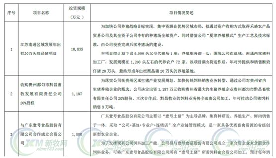 1、江蘇南通區(qū)域發(fā)展年出欄20萬(wàn)頭商品豬項(xiàng)目;2、收購(gòu)貴州都勻市黔昌畜牧發(fā)展有限責(zé)任公司20%股權(quán);3、與廣東壹號(hào)食品股份有限公司合作成立合資公司;4、成立夏津新希望六和養(yǎng)殖有限公司;5、山東嘉祥搬遷建設(shè)年屠宰3,000萬(wàn)只肉鴨項(xiàng)目;6、設(shè)立山東區(qū)域/聚落養(yǎng)殖服務(wù)公司;7、茂名六和新建飼料項(xiàng)目增加投資預(yù)算;8、樂(lè)亭六和馨美茲肉雞養(yǎng)殖公司注冊(cè)資本金變更。以上項(xiàng)目投資總額35,292萬(wàn)元。(詳見(jiàn)下表)