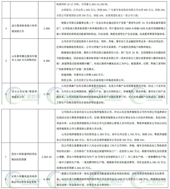 另外,為打造世界級(jí)農(nóng)牧企業(yè)的美好愿景,促進(jìn)新希望六和在飼料加工業(yè)務(wù)、養(yǎng)殖業(yè)務(wù)發(fā)展,優(yōu)化其產(chǎn)業(yè)投資布局,經(jīng)調(diào)研論證,新希望六和董事會(huì)決定實(shí)施8個(gè)投資發(fā)展項(xiàng)目,其中有5個(gè)項(xiàng)目涉及養(yǎng)殖,2個(gè)是食品屠宰,1個(gè)是飼料。