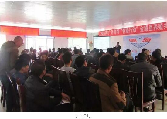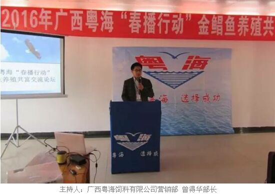 3月26日,2016廣西粵?!按翰バ袆?dòng)”金鯧魚養(yǎng)殖共富交流論壇在廣西北海市鐵山港區(qū)東苑食府舉辦,鐵山港約100名金鯧魚養(yǎng)殖戶和粵海飼料經(jīng)銷商應(yīng)邀參加了本次會(huì)議。圍繞著“如何降低養(yǎng)殖風(fēng)險(xiǎn)提高養(yǎng)殖效益”的中心主題,廣東粵海飼料集團(tuán)研發(fā)工程師蔣煥超和廣西粵海飼料有限公司營(yíng)銷部副部長(zhǎng)劉瑩麒均分享自己獨(dú)到的見解。