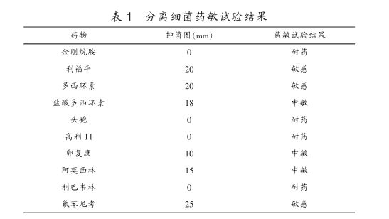 (3)藥物敏感實驗。將純化細(xì)菌接種于培養(yǎng)基進(jìn)行藥物敏感實驗。結(jié)果見表1。