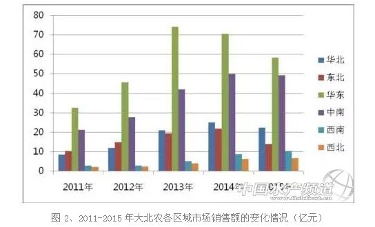華東和中南市場屬于大北農(nóng)的核心市場,但2015年華東市場的業(yè)績發(fā)生較大幅度下滑;西南、西北市場略有增長。