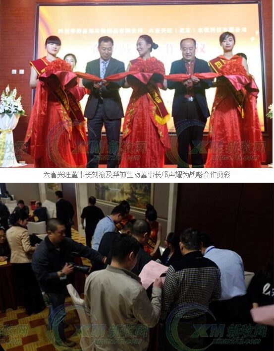 華神生物與六畜興旺簽定戰(zhàn)略合作協(xié)議。左為六畜興旺董事長劉渝,右為華神生物董事長鄺聲耀。