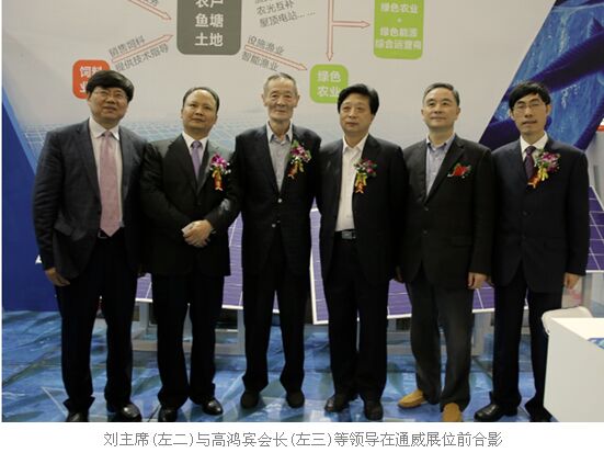 開幕式結(jié)束后,高鴻賓會(huì)長等一行領(lǐng)導(dǎo)在劉主席的陪同下到通威展臺(tái)參觀,劉主席向高會(huì)長詳細(xì)地介紹了通威“漁光一體”創(chuàng)新模式。通威“漁光一體”項(xiàng)目以光伏發(fā)電站為主,漁業(yè)養(yǎng)殖為輔,結(jié)合通威365健康養(yǎng)殖模式,拓展了通威太陽能光伏技術(shù)應(yīng)用領(lǐng)域,通過“水上產(chǎn)出清潔能源、水下生產(chǎn)安全通威魚”,達(dá)到光伏發(fā)電與漁業(yè)養(yǎng)殖的一體化有機(jī)結(jié)合,實(shí)現(xiàn)了“魚、電、環(huán)?!比S收。