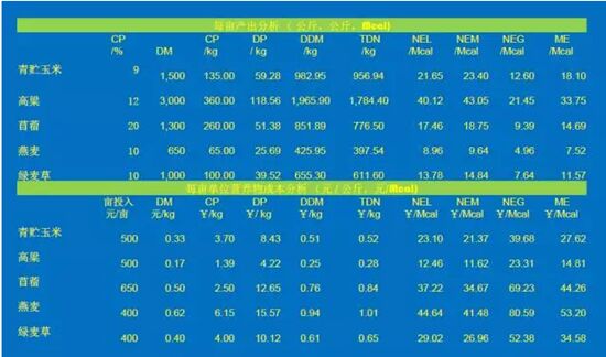 還是按這個(gè)方法計(jì)算每畝的產(chǎn)量,比如玉米、高粱是500塊錢,苜蓿650塊錢,燕麥400塊錢,綠麥草400塊錢的生產(chǎn)投入來核算的話,不算地價(jià),也會算出來每畝地要生產(chǎn)出來的干物質(zhì),折合成每公斤是多少錢,那么最便宜的0.17,那就是甜高粱。