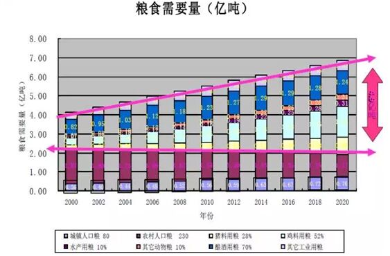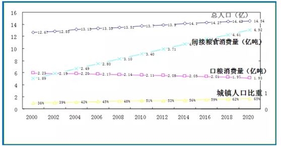 城鎮(zhèn)人口的比例從2000年的36%,按照國家規(guī)劃到2020年達(dá)到70%,這個(gè)速度是在加快的。間接的糧食消費(fèi)主要從2000年的1.8億噸一直到4億噸,人口總量估計(jì)到14億,在這種情況下實(shí)際人吃的糧食穩(wěn)定在2億噸左右,歷任的農(nóng)業(yè)部長都在搞糧食增產(chǎn),以糧為綱這個(gè)理念非常深。按照城鎮(zhèn)化的比例可以算一筆帳,如果按照14億人來說,咱們現(xiàn)在農(nóng)村的人口吃的口糧大概230~240公斤左右,城鎮(zhèn)人口是80公斤,一個(gè)農(nóng)村人口要吃掉城鎮(zhèn)人口3倍的糧食。按照2003年的生活水平來計(jì)算,很多農(nóng)民進(jìn)城以后,他的口糧也會降下來,降的結(jié)果是到2020年的時(shí)候雖然人口在增加,但我們的口糧不會增加反而會減少,就是1:3的關(guān)系。