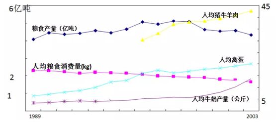 若保持14年來年均節(jié)約口糧數(shù)(32.14億公斤)、年均新增人口速率(1179萬人)不變(據(jù)國家計(jì)生委2003年人口預(yù)測結(jié)果,2004年以后每年新增人口數(shù)在600~1000萬之間),每年節(jié)約的口糧數(shù)大大高于每年新增人口對口糧的需要量。而城鎮(zhèn)人口口糧消費(fèi)則更進(jìn)一步由1989年的133.9公斤下降到2003年的79.5公斤,下降了40.63%,為全國平均口糧的約1/2。與此同時(shí),動(dòng)物食品的消費(fèi)量成倍大幅上升,可以說這是我國史無前例的動(dòng)物性食物“大躍進(jìn)”,這就表明動(dòng)物性食物在我國食物資源中所占比重迅速增加。