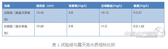 (1)、水質(zhì)狀況選取2個對照組池塘,面積分別為10畝和15畝,均為室外養(yǎng)殖池,在3個月時間內(nèi)與試驗池進行水質(zhì)比較,進行透明度、氨氮、亞硝酸鹽等指標(biāo)的測試與對比,結(jié)果見表1。
