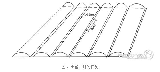 該設(shè)施因形狀像整理好的田壟而得名(見圖2),壟頂與壟底高度差是4cm,每個壟之間的距離為70cm,在田壟溝里有已經(jīng)鋪好了用聚氯乙烯材料制作的管道,管道的上方打滿了小孔,小孔孔徑5mm,孔與孔間距為8-10cm,這些管道打好孔之后半埋在田壟溝里,田壟溝里的所有排污管與養(yǎng)蝦池一端的排水溝都是相通的,在水流的帶動下殘餌糞便等雜物會在池底逐漸聚集在一起,當(dāng)打開排污的閥門時,蝦池里的殘餌和糞便便會在水壓的作用下進入管道并通過管道流出流水溝,從而保持水質(zhì)的清潔。