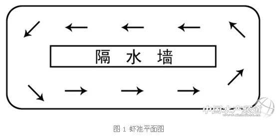在蝦池中間加道隔水墻,隔水墻和池壁之間留有空隙,這樣在進水或充氧時蝦池里的水就會圍著隔水墻轉(zhuǎn)起來,靜水變成了流動的水,由于流水的狀態(tài)像田徑跑道的樣子故得名“跑道式蝦池”(見圖1)。隔水墻從頂部到池底距離大約2m左右,隔水墻頂部寬度0.4m左右,平時隔水墻是飼養(yǎng)員通行和檢查的通道,隔水池的兩端和池壁不是連在一起,間隔距離2m左右,兩端間隔的作用就是讓池水動起來。