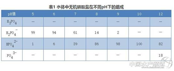 磷在環(huán)境中存在有多種形態(tài),天然水體內(nèi)的磷通常都是+5價(jià)的,成正磷酸鹽形式或有機(jī)磷化合物形式存在,即溶解無(wú)機(jī)磷、溶解有機(jī)磷、顆粒磷,無(wú)機(jī)磷酸鹽的陰離子有P043-、HP04-,H2P04-,這些形態(tài)存在于水溶液中,其相對(duì)濃度取決于水的pH值(見(jiàn)表1)。