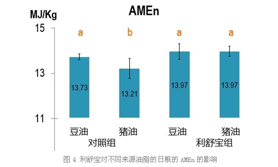 4 不同來(lái)源的油脂的消化代謝試驗(yàn) 從圖4利舒寶對(duì)不同來(lái)源油脂的日糧的消化代謝試驗(yàn)結(jié)果可以看出,日糧中添加利舒寶能夠提高日糧的AMEn。從數(shù)值上看豬油型日糧中添加利舒寶可以顯著提高日糧的表觀代謝能,提高了182 Kcal/kg,豆油型日糧雖然提升幅度沒(méi)有達(dá)到統(tǒng)計(jì)學(xué)上的顯著性差異,但是從數(shù)值上也提高了57.3 Kcal/kg。