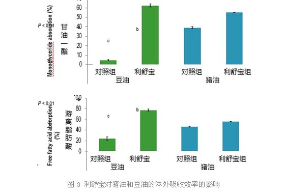 從圖2的利舒寶對(duì)不同來(lái)源的油脂體外試驗(yàn)的結(jié)果來(lái)看,添加利舒寶可以顯著提高豆油和豬油的水解效率。相比利舒寶對(duì)豆油的水解效率的提升來(lái)看,添加利舒寶對(duì)豬油的提升效果要顯著優(yōu)于豆油。在沒(méi)有使用利舒寶的條件下豬油的水解效率要低于豆油(圖1),但是當(dāng)使用利舒寶之后豬油的水解效率在一定程度上達(dá)到甚至要優(yōu)于豆油。