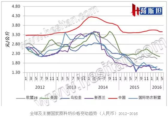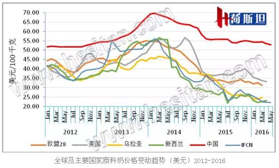 新西蘭4月原料奶平均價格為33.4新幣/100kg(人民幣,1.49元/公斤),已連續(xù)兩個月環(huán)比持平。恒天然5月26日宣布2016/17產(chǎn)季(2016年6月1日-2017年5月31日)原料奶價格為每公斤乳固體為4.25新幣(折合原奶1.63元人民幣/kg),比目前價格上漲0.35新幣/公斤乳固體,漲幅為9%。恒天然首席執(zhí)行官施牧德Theo Spierings在宣布奶價時說,全球供應增長正在放緩,全球乳品需求預計依然以每年2-3%速度增長,且主要乳制品進口市場2016年進口量與2015年同期相比有所增長,我們對中國乳品消費增長持保持樂觀態(tài)度,從最近GlobalDairyTrade拍賣的情況來看,中國進口需求也在穩(wěn)定增長,這些驅(qū)動因素將導致全球乳品交易市場再平衡。