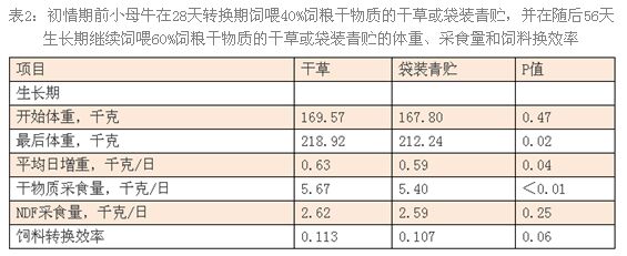 在該研究中,在28天轉(zhuǎn)換期內(nèi)飼喂含40%飼糧干物質(zhì)的干草或袋裝青貯的小母牛,提高了平均日增重,而在另行的56天生長期喂給60%飼糧干物質(zhì)的干草時,繼續(xù)提高了日增重(表2)。