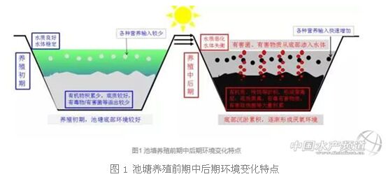 經(jīng)過苗期養(yǎng)殖,此時,養(yǎng)殖品種迎來了快速生長階段,飼料投喂量和投喂頻率快速增加,池塘產(chǎn)生大量殘餌、糞便等,池塘水體的外源性營養(yǎng)(如N源、P源)輸入過多,這也導(dǎo)致水體有機質(zhì)快速增加,池塘水體的分解壓力加大。