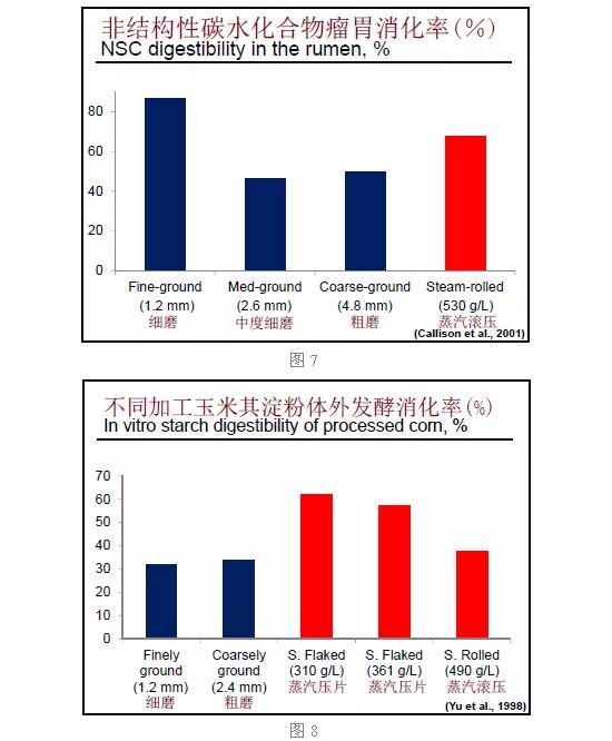 不同的加工方式對玉米淀粉消化率也有影響。如圖6是三種不同的粉碎程度,細磨的在瘤胃中消化速度達到60%,相對來看,粗磨的在瘤胃中消化率較低。假設十公斤細磨和十公斤粗磨的玉米,在紙上看配方是一樣的,但實際上玉米進到瘤胃以后消化速率不一樣,因為磨細程度不同。